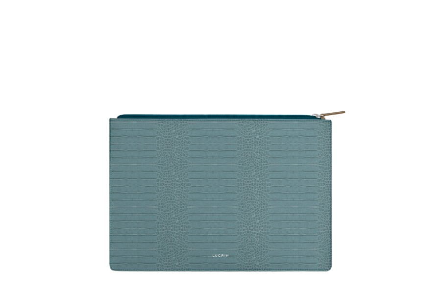 El estampado de cocodrilo en piel de becerro propuesto por Lucrin es uno de los más bellos en el mercado. Los productos fabricados en auténtica piel de cocodrilo son muy caros y esta versión es una buena alternativa. El exterior tiene un tono ligeramente brillante que proporciona un look glamuroso y moderno, y la imitación de las escamas son casi perfectas.