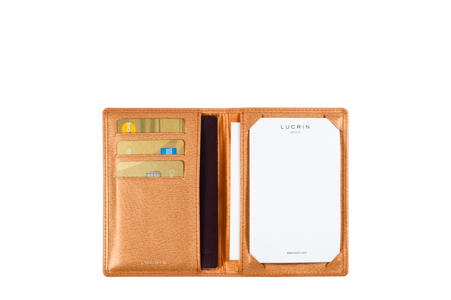 Escritorio de bolsillo. Con compartimento derecho escritorio y espacio para pasaporte formato internacional. Lado izquierdo: compartimento para tarjeta de visita y compartimento grande. Se vende con 10 hojas blancas. Dimensiones abierto: 19,5 x 14 cm.