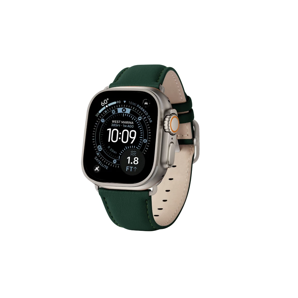 Correa de cuero para Apple Watch Ultra con hebilla clásica - Adaptador plateado - Verde Oscuro - Piel de becerro Verde Oscuro  - Piel de becerro lisa