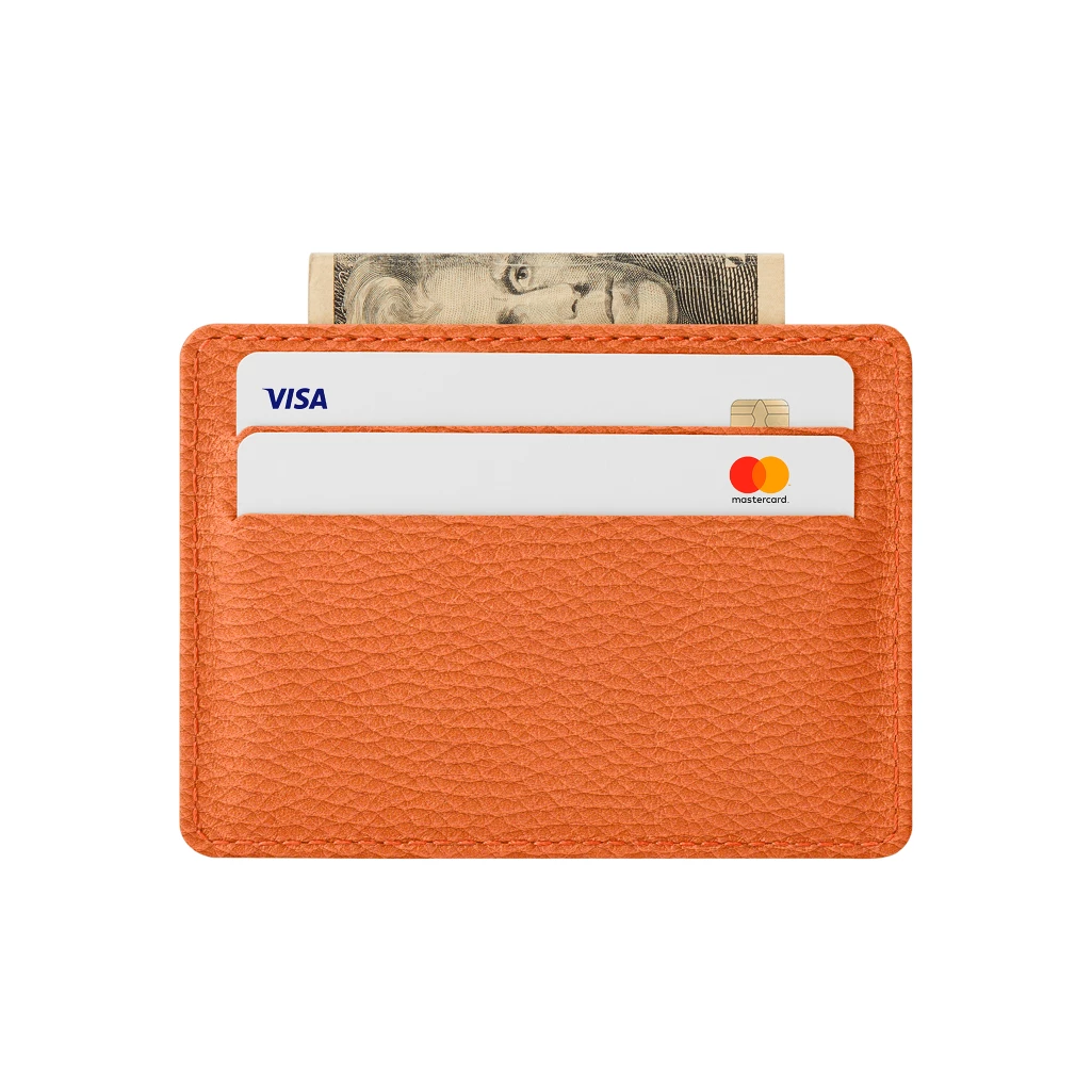 Podrá deslizar 2 tarjetas de crédito dentro de cada cara de este estuche, con 2 bolsillos cada una. En el bolsillo plano interior puede almacenar otras tarjetas, así como un par de billetes o recibos. Este bolsito tarjetero, simple a la par que práctico, está fabricado con cuero de primera calidad.