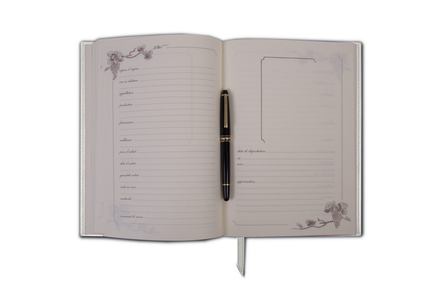 Libro de bodeg adispone de un espacio para pegar la etiqueta de la botella, la fecha, el lugar y con quién lo degustó, as í como la valoración. El libro incluye un marcapáginas de cuero.