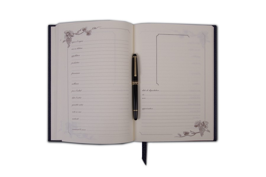 Libro de bodeg adispone de un espacio para pegar la etiqueta de la botella, la fecha, el lugar y con quién lo degustó, as í como la valoración. El libro incluye un marcapáginas de cuero.