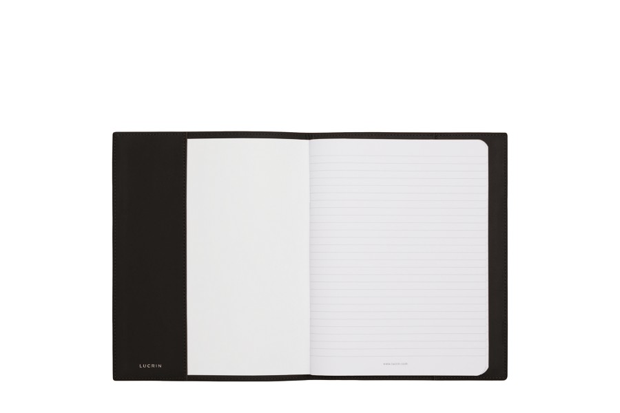Hecha en auténtica piel de primera calidad, esta funda protectora para cuadernos de formato A5 (de alrededor de 50 páginas) es un productor bonito y duradero. Embellecerá el cuaderno convirtiéndolo en algo con mucha más clase. Es duradera, puesto que ha sido concebida por los mejores artesanos expertos en piel de Lucrin. El cuaderno se sostiene bien en su lugar gracias a dos tiras de piel en cada lado, en las que puedes deslizar la tapa dura del cuaderno.