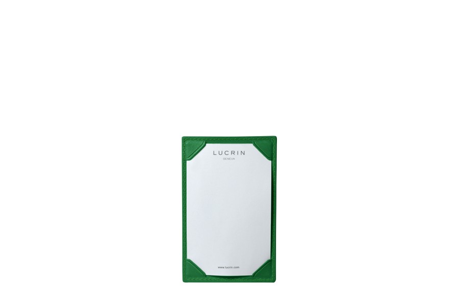 Este bloc de notas, que no es nada voluminoso, es ideal para escribir notas, pensamientos o números de teléfono. En una cara tiene el bloc de notas básico en el que las hojas están sujetas por 4 esquinas con ranuras. En la otra cara dispone de una abertura en la que poder guardar recambios de papel o cualquier tarjeta de tamaño estándar o tamaño tarjeta de crédito. Por supuesto, todos nuestros blocs de notas se entregan con hojas blancas LUCRIN en bloques de papel de repuesto.